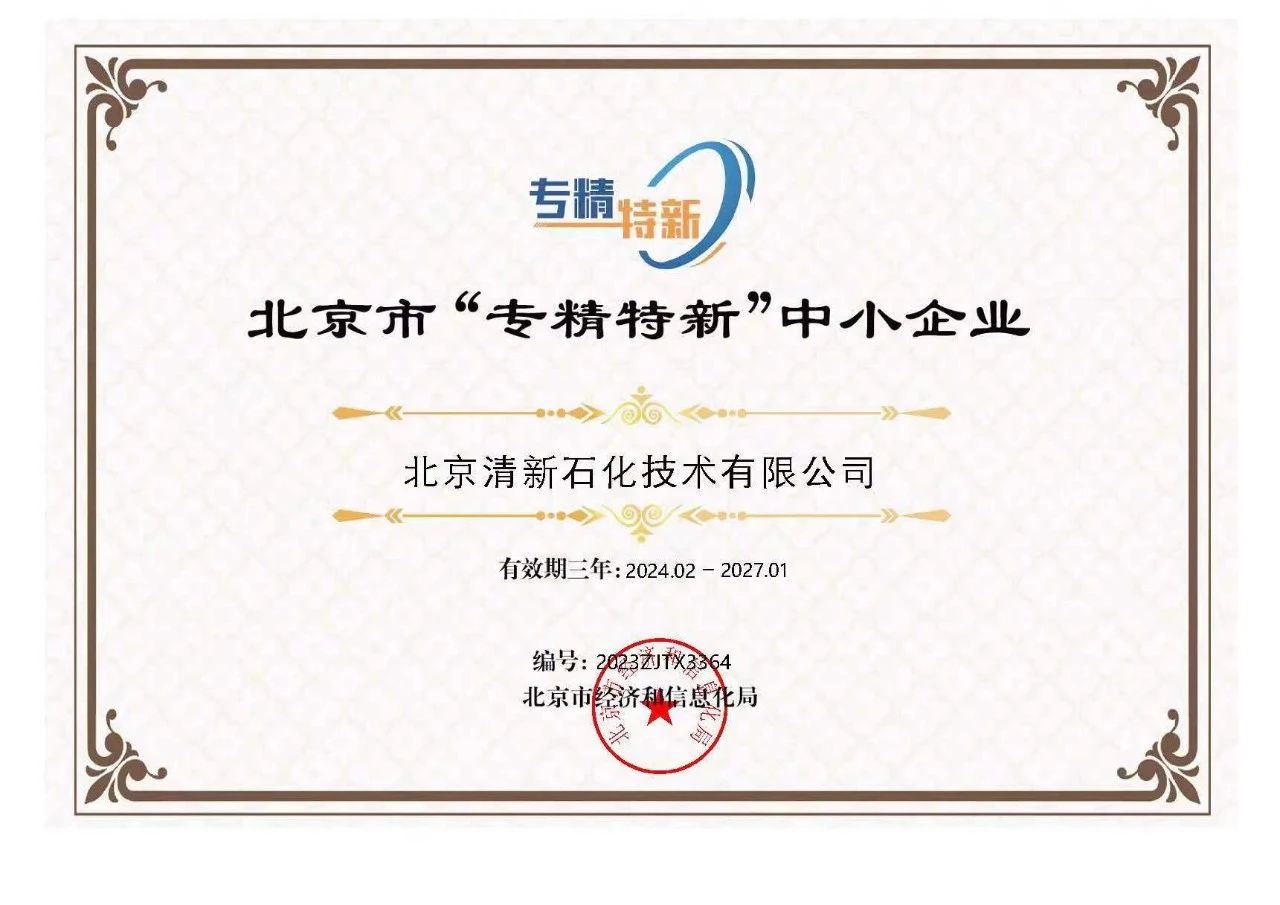近日,北京市經濟和信息化局發布了《關於對2023年第四季度北京市專精特新中小企業名單進行公告的通知》,茄子视频在线免费观看環境(jìng)子公司北京茄子视频在线免费观看石化技術有限公司(以下簡稱“茄子视频在线免费观看石化”)獲得北京市“專(zhuān)精特(tè)新”中小企業(yè)稱號。